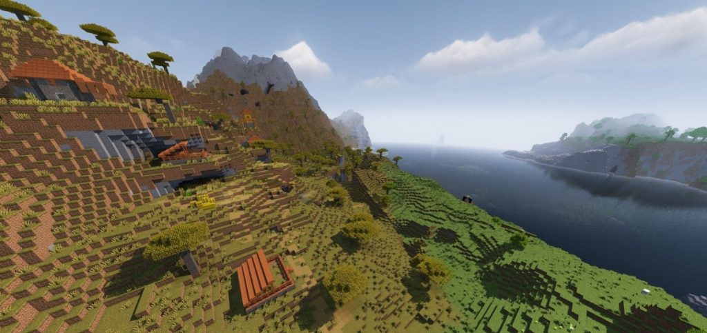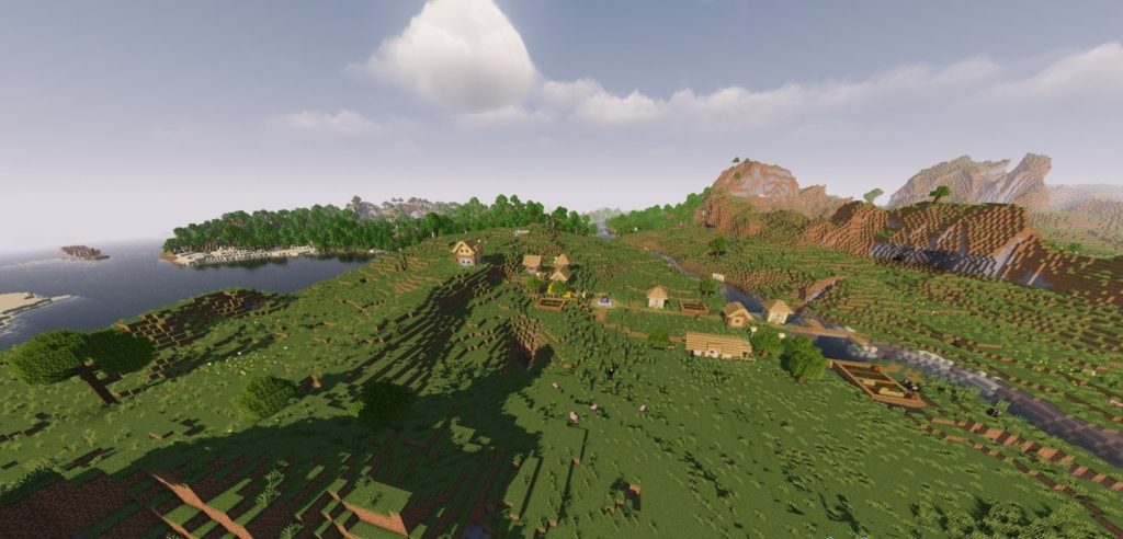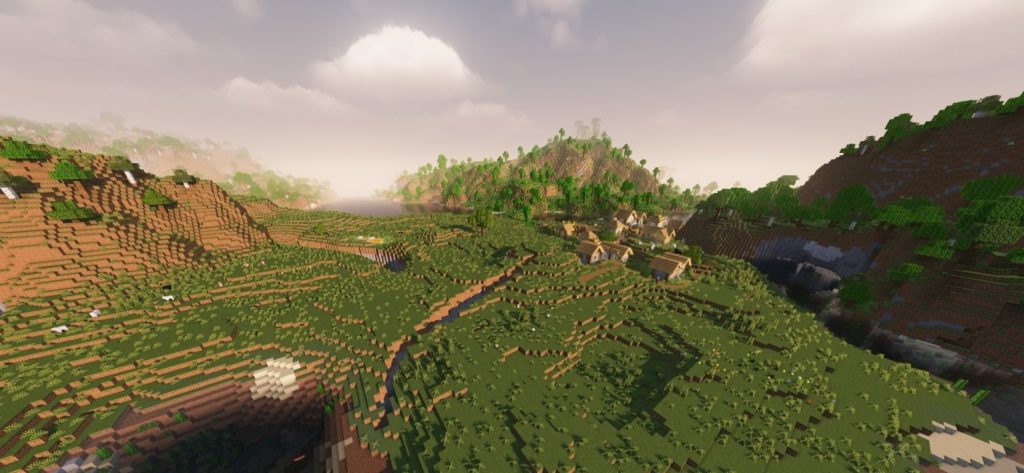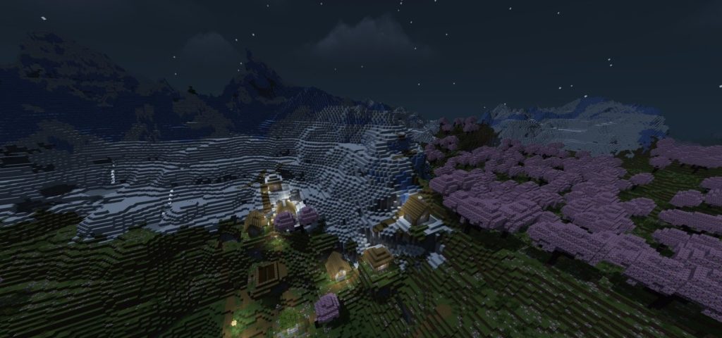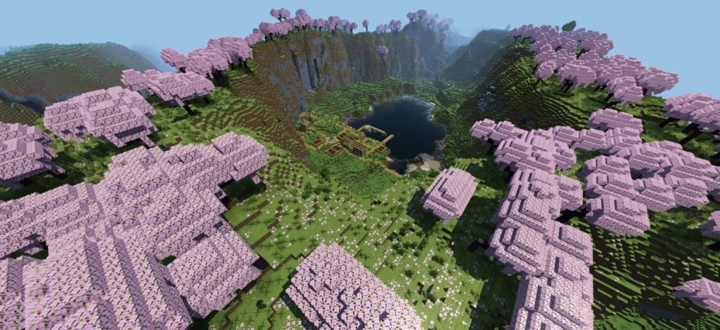 Ein Dorf, das sich in der Nähe eines von Sakura-Bäumen umgebenen Tals befindet. Es bietet eine äußerst ästhetische Umgebung und wirkt fast so, als wäre es manuell dort platziert worden. Mit der Anmut seines sanft gestalteten Tals belegt dieser Seed den zweiten Platz in unserer Liste. Auch hier gilt: Selbst ohne Shader ist der Anblick wunderschön. Wenn Sie jedoch Shader nutzen, verdoppelt sich der visuelle Genuss durch die fantastische Atmosphäre.